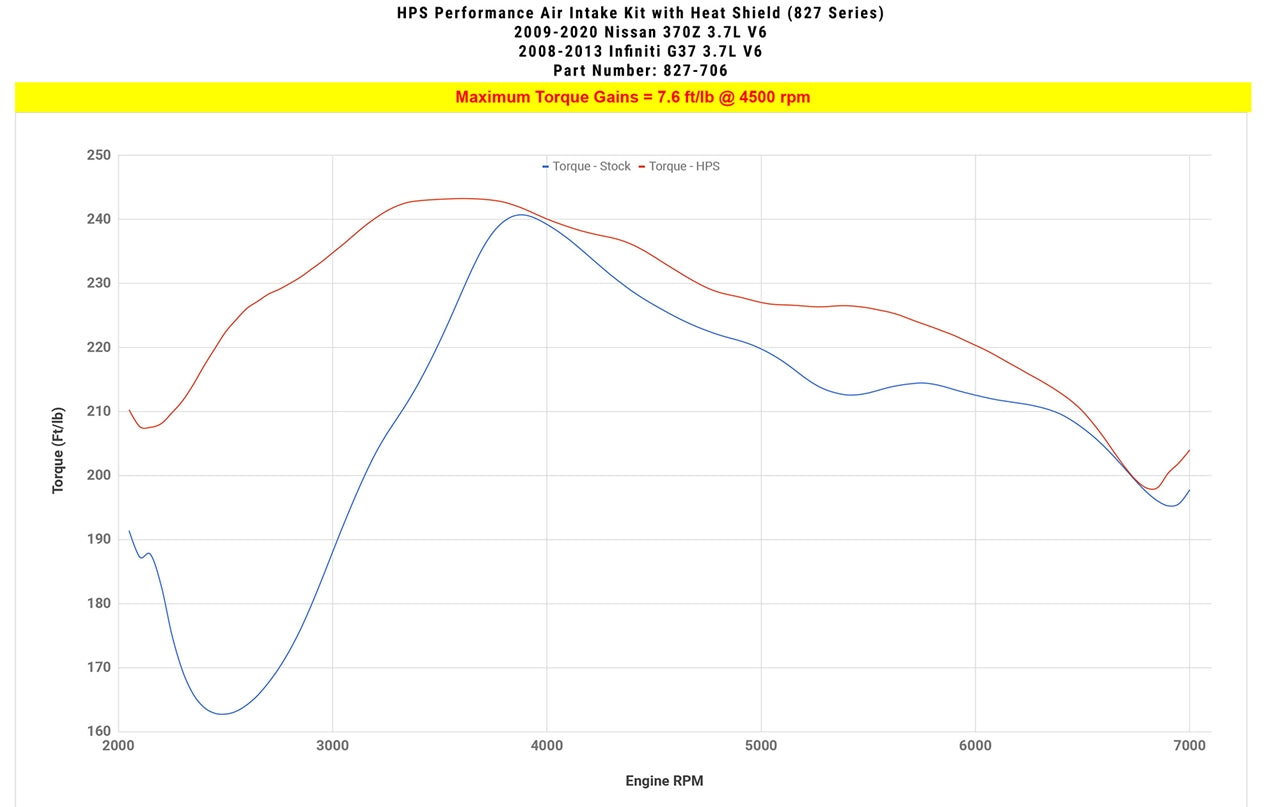 - Delivers dyno proven performance gains - increase horsepower +11 whp , torque +7.6 ft/lbs and improve throttle response. Fine-tuned by HPS Performance to deliver the maximum performance output through the top end power band.
