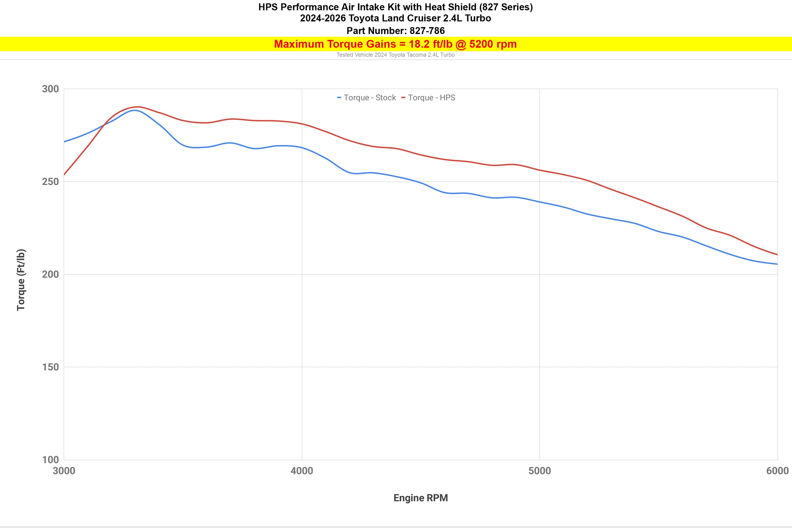 This HPS Performance Air Intake Kit is a direct upgrade that replaces the restrictive stock intake and air box to unleash hidden horsepower and torque. Dyno-tested for proven gains, this high-performance system delivers an impressive increase of 18 horsepower and 18.2 lb-ft of torque, resulting in quicker throttle response and noticeably reduced turbo lag. At the core of this kit is a 3" mandrel-bent aluminum intake pipe that replaces the factory plastic tubing, dramatically improving airflow and allowing your engine to breathe more efficiently. Along with the performance gains, this upgrade enhances your Land Cruiser's engine sound for a more aggressive and satisfying tone. Engineered for both power and reliability, the kit includes a heavy-duty 3-ply reinforced silicone coupler that withstands high temperatures, premium stainless steel embossed hose clamps for corrosion resistance, and a high-flow, washable 4-ply pre-oiled cotton air filter for long-term performance. The HPS Dual-Cone Air Filter features an open-top design with a secondary cone to maximize airflow efficiency—allowing incoming air from the SUV’s duct to reach the top of the filter directly, bypassing the limitations of traditional closed-top filters. To ensure cool, dense air reaches your engine, the system also includes a custom heat shield and lid that fits cleanly in the engine bay, delivering both function and a sleek, high-performance look. Designed for straightforward installation with basic hand tools, this bolt-on intake kit requires no tuning or further modifications—making it one of the easiest and most effective ways to enhance your turbocharged SUV. Experience the perfect combination of increased power, refined durability, and bold style with the HPS Performance Air Intake Kit.