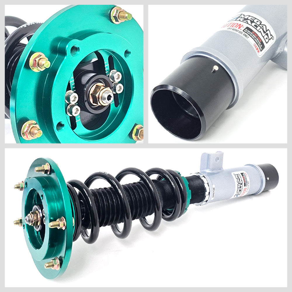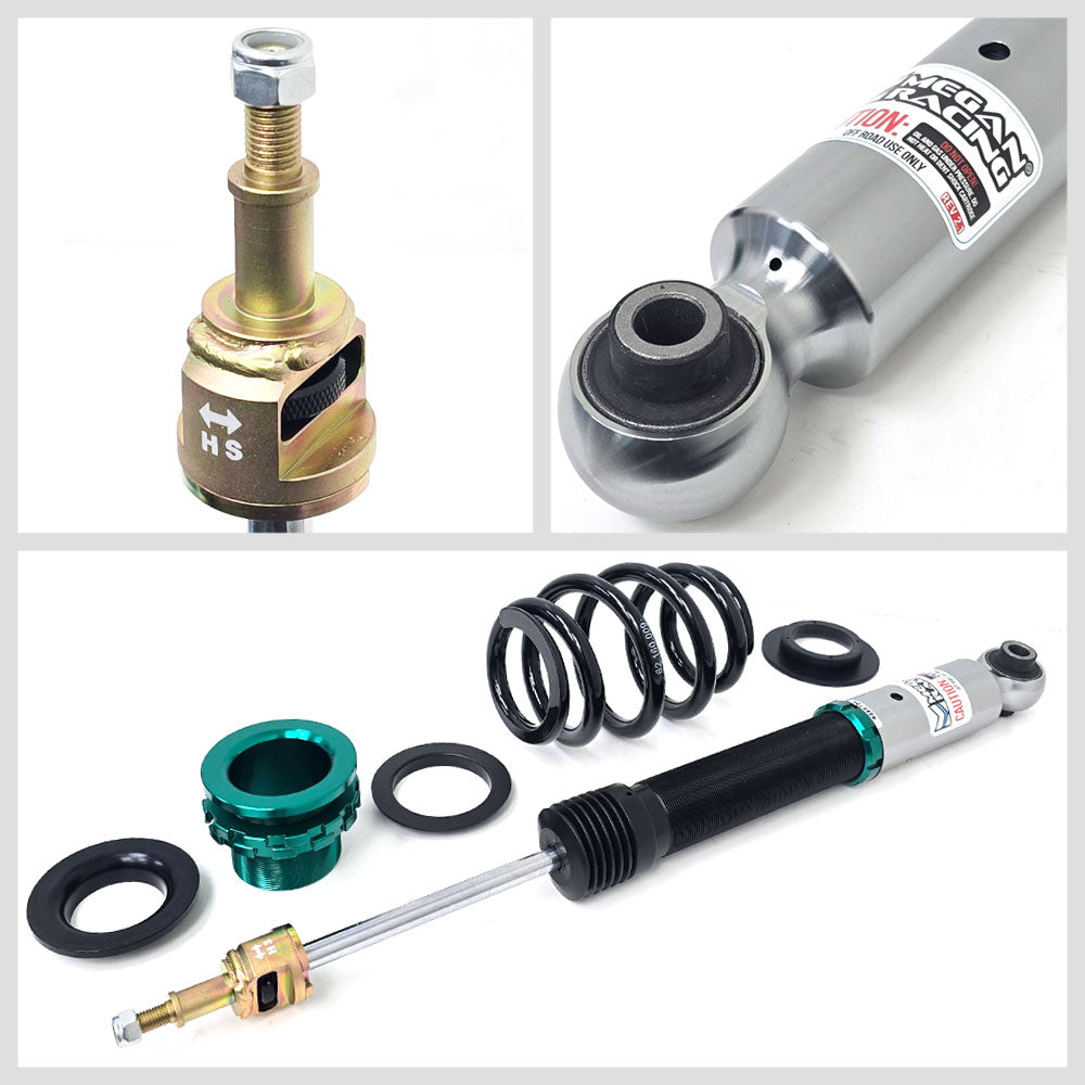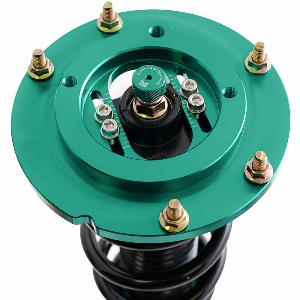 Megan Racing Coil Over Dampers are the ultimate upgrade to your track or street car. Featuring 32 levels of damper force adjustment, camber adjustable pillowball front top mounts and shock length adjustment allowing you to retain full suspension stroke and to fine tune your suspension characteristics. Compression and rebound settings are easily adjusted through a single damper adjustment knob which is built-in at the top of the damper mount for easy access. Adjustments are simple to tune according to your style of driving and desired comfort level whether you are a professional certified mechanic or an automotive enthusiast with amateur mechanical skills.