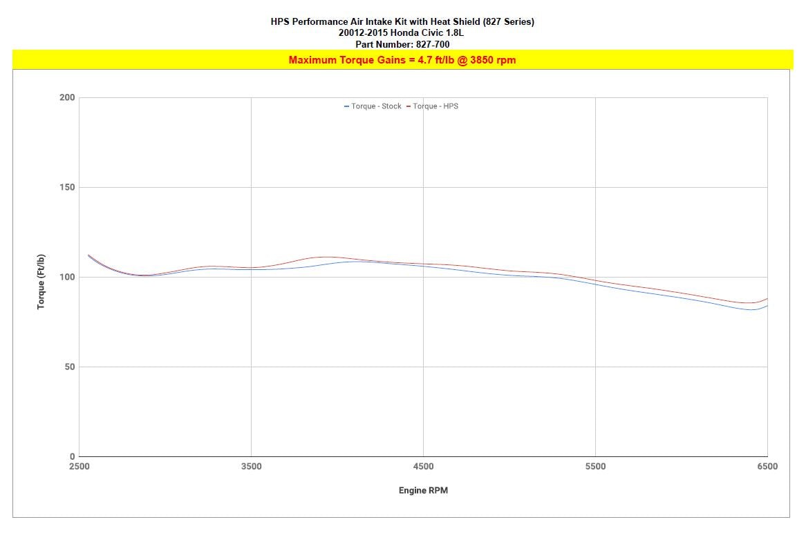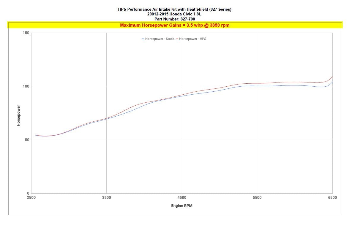 HPS Performance 827 Series air intake kit (Part # 827-700BL) for 2012-2015 9th Gen Honda Civic 1.8L Gas offers a free-flowing 2-3/4 inch mandrel-bent aluminum tube induction system designed to produce dyno proven performance gains - increase horsepower +3.5 whp , torque +4.7 ft/lbs and improve throttle response while maintaining a safe air fuel ratio. The heavy duty powder coated steel heat shield integrates with the factory fresh air scoop to direct cold air to the air filter for the best cooling effect. The included installation manual has clear pictures and instructions to guide the installer throughout the whole process. The kit does NOT require tuning and does not trigger CEL light. No modification is required during the installation. HPS light weight mandrel-bent aluminum alloy tube replaces the stock restrictive air box and optimizes the airflow with excellent heat dissipation and long lasting durability. Built with race proven high temperature reinforced silicone hoses and industrial grade 100% stainless steel t-bolt clamps, HPS Performance 827 Series Air Intake Kit delivers ultimate reliability even during the most extreme driving conditions. Proudly made in the USA, the HPS Performance Air Filter is designed with performance in mind, delivering excellent filtration without sacrificing airflow.