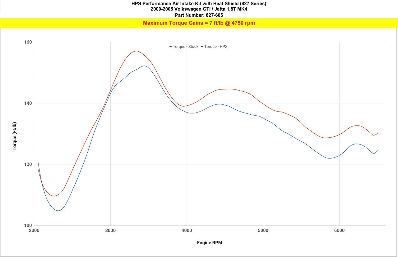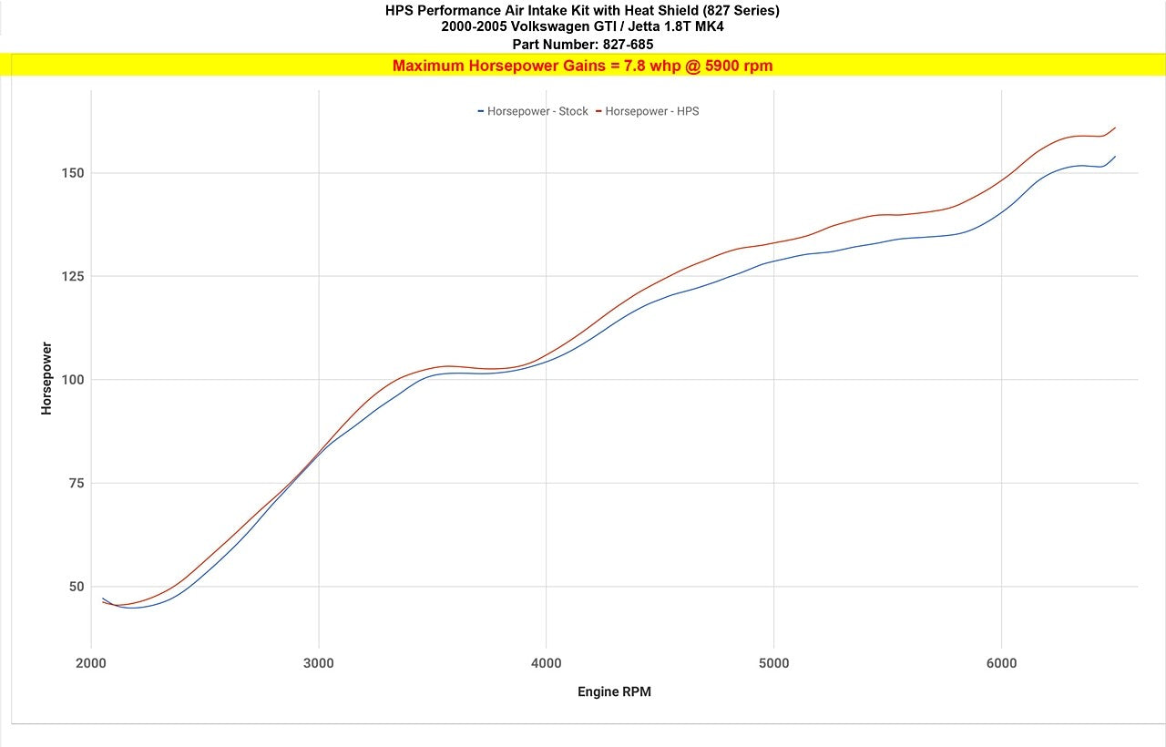 The All-New HPS Performance 827 Series Air Intake Kit Polish (Part# 827-685P) for 2000-2006 Volkswagen Golf / GTI MK4 1.8T Turbo, 2000-2005 Volkswagen Jetta MK4 1.8T Turbo offers a free-flowing 2-3/4"" mandrel-bent aluminum tube induction system designed to produce dyno proven performance gains - increase horsepower 7.8 whp , torque 7 ft/lbs and improve throttle response while maintaining safe air fuel ratio. The heavy duty powder coated steel heat shield integrates with the factory fresh air scoop to direct cold air to the air filter for the best cooling effect. The included installation manual has clear pictures and instructions to guide the installer throughout the whole process. The kit does NOT require tuning and does not trigger CEL light. No modification is required during the installation. HPS light weight mandrel-bent aluminum alloy tube replaces the stock restrictive air box and optimizes the airflow with excellent heat dissipation and long lasting durability. HPS Performance 827 Series air intake kit features race proven reinforced silicone hoses and industrial grade 100% stainless steel T-bolt clamps which ensures reliability, even during the most extreme driving conditions. The All-New HPS Performance Air Filter is designed with performance in mind, delivering excellent filtration without sacrificing airflow. All HPS Performance Air Filters are made in the United States.