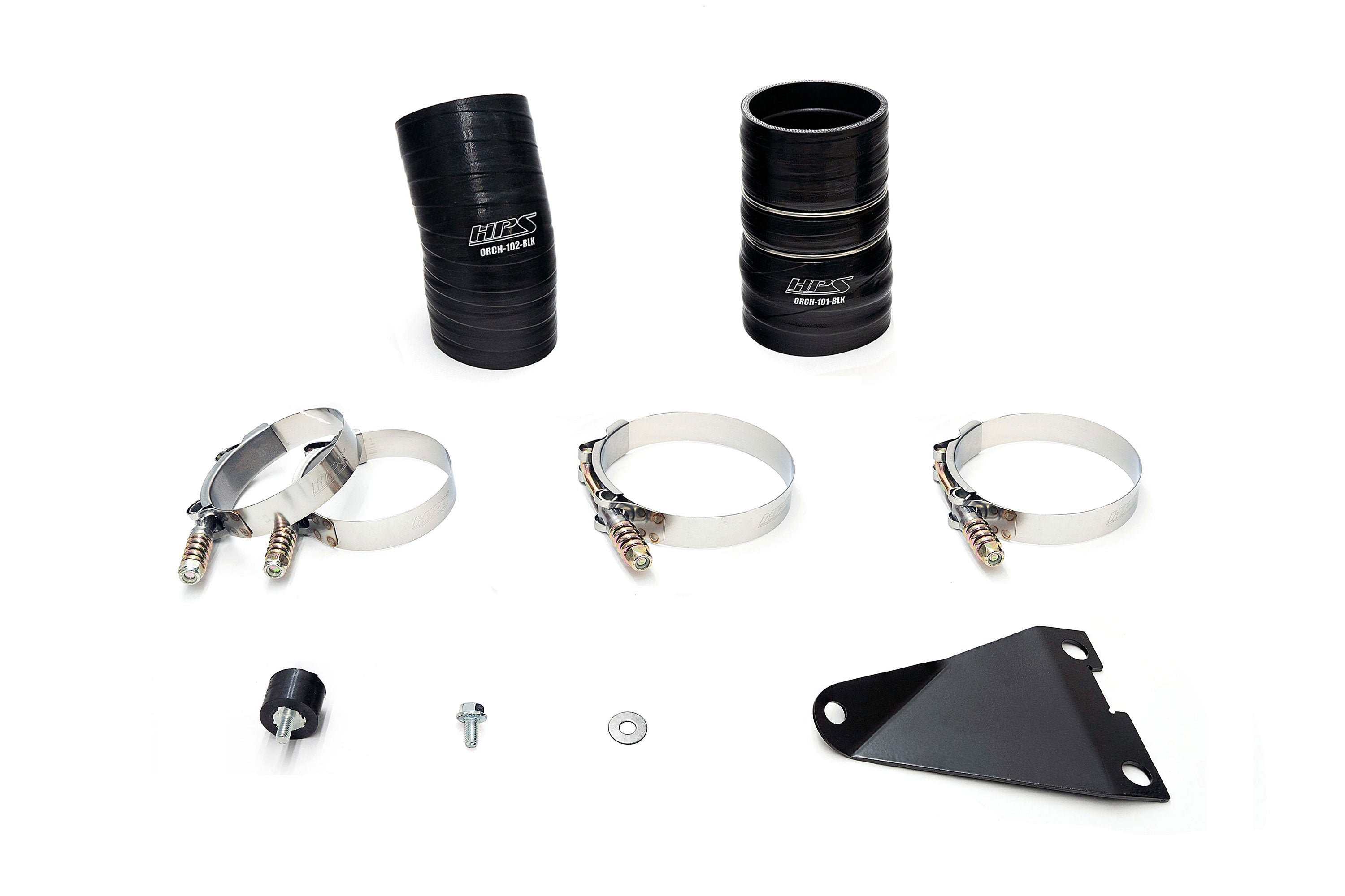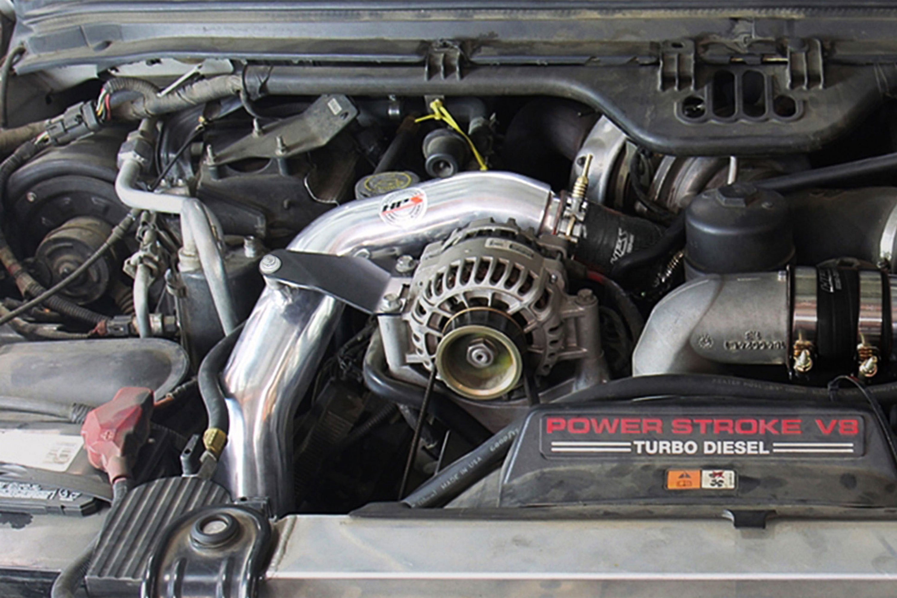 This HPS Hot Charge Pipe Kit addresses some of the most common issues that owners eventually come across on their 6.0L Powerstroke. From cracked piping to worn out boots, HPS has the solution to keep your truck up and running regardless of how harsh the operation conditions are—even the hottest days. The factory hot side pipe is notorious for failing at the boots as it sits in the engine bay without any reinforcements to hold it in place. This puts a lot of stress on the boots and often leads to premature failure. A custom brace is included in the kit to help mount it in place and take the pressure off of the connecting points. HPS has engineered this pipe using mandrel-bent 6061-grade aluminum tubing to reduce weight by approximately 50%. This upgraded pipe also boasts performance gains as the smoother pathway improves air flow, allowing better throttle response and faster acceleration for better drivability. The stock intercooler boots are made of silicone and are reinforced with just two layers of polyester. Because the 6.0L Powerstroke engines breathe a lot of oil through the turbo, these stock parts will degrade, become soft, and eventually rip or blow through. The custom black boots in this kit are designed with 4-plies of high-temperature, high-pressure, and oil-resistant silicone material that will withstand the constant flow of oil without compromising their integrity. Held in place using HPS Stainless Steel Spring-Loaded T-bolt Clamps, fluctuations in temperature do not require maintenance as they provide constant tension to accommodate for these changes. Crafted to resist corrosion, these clamps will stand up against the elements with ease.